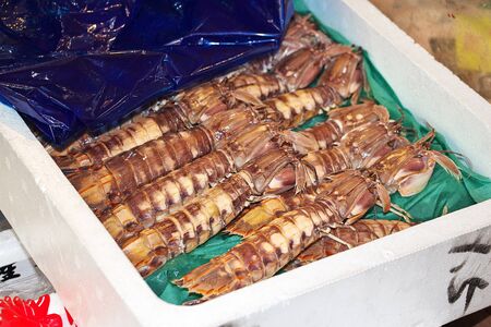 very fresh crustaceans called mantis shrimp for sale in fish market