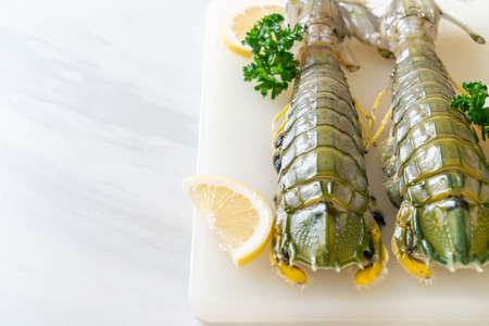 Raw flathead lobster shrimps on ice, fresh slipper lobster flathead for cooking with herbs and spices parsley lemon in the seafood restaurant or seafood market, Rock Lobster Moreton Bay Bug