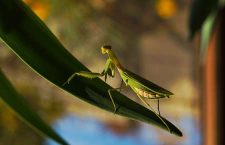 Close up of praying mantis on a green leaf. (Mantis religiosa)