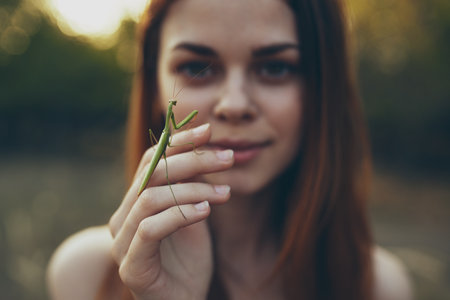 red-haired woman with a praying mantis in hand nature stroll