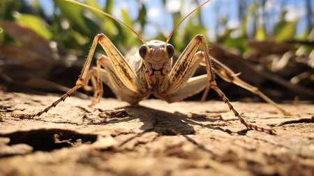 A grasshopper is positioned at the center, highlighting the texture of its hard exoskeleton and the large complex eyes.