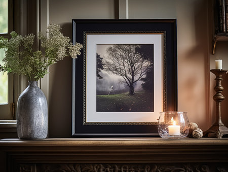 Vintage black and white family portraits frame rustic mantel with antique decor, candles, intricate frames, dim lighting