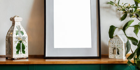 Blank white frame mockup on wooden shelf with plant decoration.