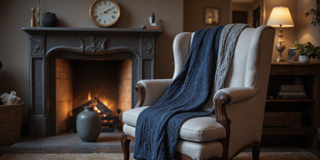 Cozy living room interior with armchair, candles and knitted plaid
