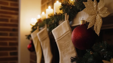A beautifully decorated Christmas mantel featuring cozy white stockings, festive ornaments, and glowing candles, creating a warm holiday ambiance in a stylish setting.