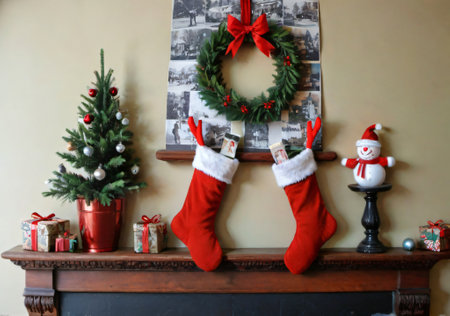 A cozy holiday scene featuring a decorated fireplace with stockings hung, adorned with greenery and lights, surrounded by wrapped gifts and a Christmas tree in the background