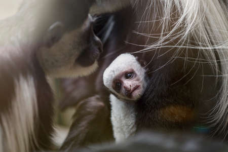 A baby Abyssinian colobus drinks its mothers breast milk in the evening sunlight. Newborn Abyssinian colobus. Black monkeys with long white tails