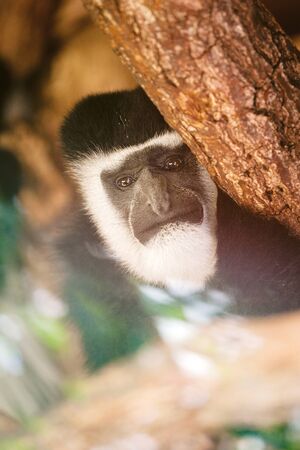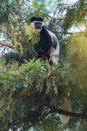 White-tailed Colobus Monkey sitting on a tree branch. Black-and-white colobuses (or colobi) are Old World monkeys of the genus Colobus, native to Africa.