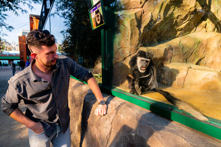 09 14 2024. Russia, Yekaterinburg, zoo visitor examines a monkey