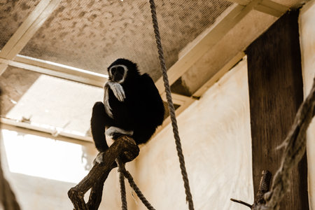 selective focus of ropes near cute monkey in zoo