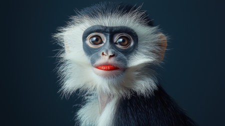 A monkey with distinctive black and white fur exhibits large expressive eyes and bold red lips, showing its unique appearance against a neutral backdrop.