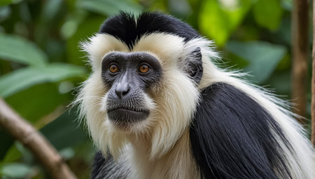 A black and white monkey sitting in a tree with leaves, AI