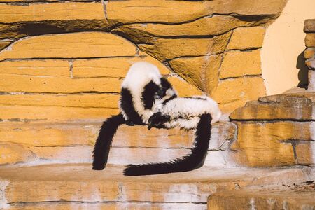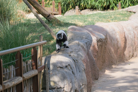 black and white lemur Ruffed Varecia variegata variegata in open zoo area. High quality photo