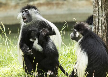 Black-and-white colobus, Old World monkeys of the genus Colobus, native to Africa. Exotic monkeys in the Monkey Forest in Yodfat, Israel. Natural conditions for freely moving animals