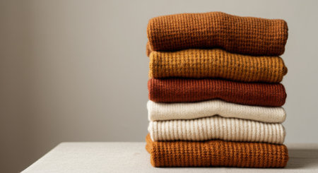 A neat pile of folded knit sweaters in warm, earthy, and autumnal colors such as rust, ochre, brown, and cream. The soft, textured fabrics, including wool and cashmere, are stacked on a light linen surface against a plain, neutral background. Soft, natural light enhances the cozy, comfortable, and warm 'hygge' feeling of the scene, perfect for fall or winter concepts.