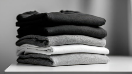 Neatly folded stack of monochrome blank t-shirts on clean background, minimal retail display concept