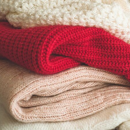 Stack of cozy knitted autumn and winter sweaters on a neutral background. Concept of warmth and comfort clothes. Banner