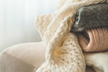 A stack of knitted sweaters in the interior of the living room. The concept of autumn winter comfort