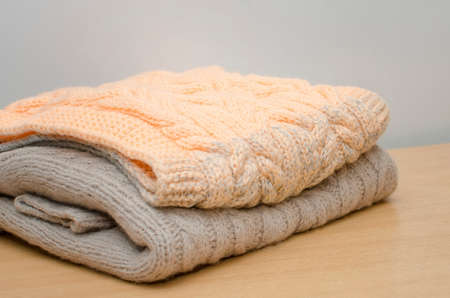 two stacks of warm sweaters on the table on a light background horizontal