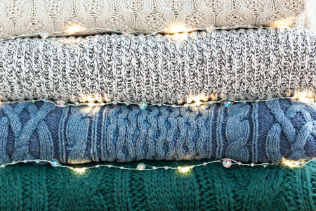 Stack of warm sweaters as background