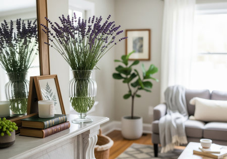 Lavender bouquet in a clear glass vase placed on a white fireplace mantelpiece, styled with vintage books, a candle, and a mirror in a bright, cozy living room interior.