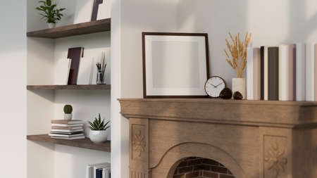 Empty picture frame mockup for display your artwork on a classic vintage wood fireplace with home decor in minimal Scandinavian style. Living room interior. 3d rendering, 3d illustration