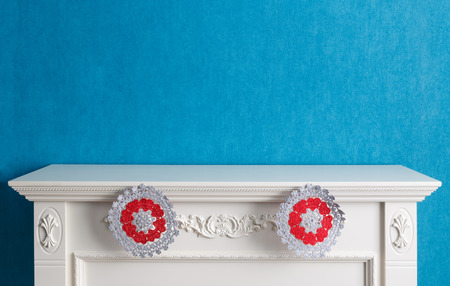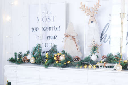 Christmas decoration with golden frame on mantelpiece against white wall background