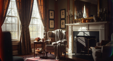 Decorative autumn garland with warm lights adorns a cozy fireplace in a welcoming living room filled with family photos