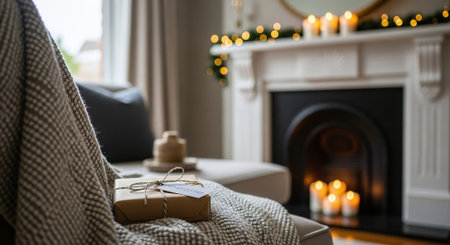 Christmas gift box wrapped in brown craft paper and tied with twine on sofa in cozy living room with fireplace