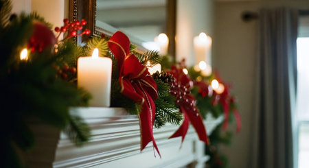 Christmas decoration on the fireplace with burning candles and red ribbons.