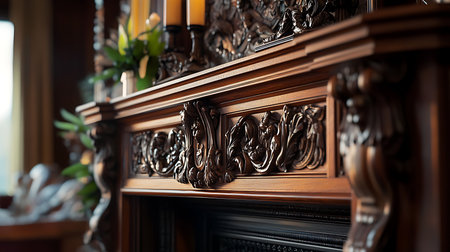 Explore the detailed craftsmanship of a wooden mantel enhancing the warmth of a cozy living space.