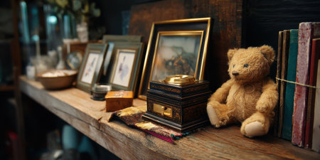Vintage teddy bear sits beside antique box and framed art rustic wooden shelf, nostalgic warm