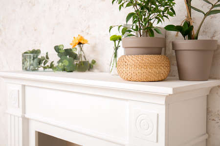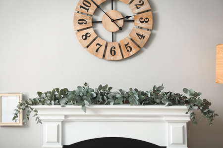 Beautiful garland with eucalyptus branches on mantelpiece in room
