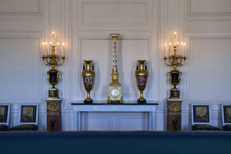 Litomysl, Czech Republic, 17 April 2022: castle chateau baroque representative interior with baroque classic furniture, vintage framed photographs on the table, porcelain figurines