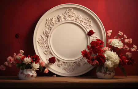 a plate of flowers made into a circle on a shelf