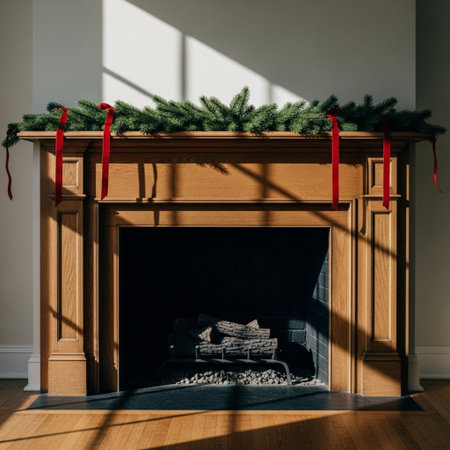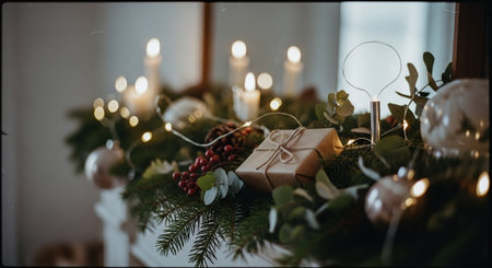 Elegant holiday decor graces a fireplace mantle with soft lighting, bringing warmth and charm to a cozy home setting. Delightful candles illuminate festive greenery and ornaments.