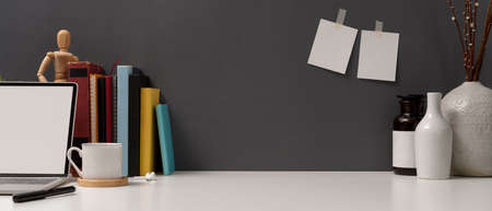 Close up view of study table with copy space, mock up laptop, books, supplies and ceramic vases on white table