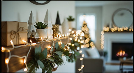 A cozy holiday scene featuring a decorated mantel with wrapped gifts, candles, and a small Christmas tree being adorned with an ornament