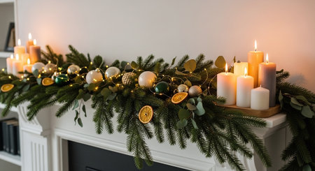 A beautifully decorated fireplace mantel with greenery, candles, and ornaments, featuring warm lighting and dried orange slices