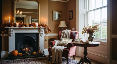 Cozy home interior with fireplace and armchair. Autumn still life