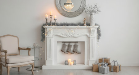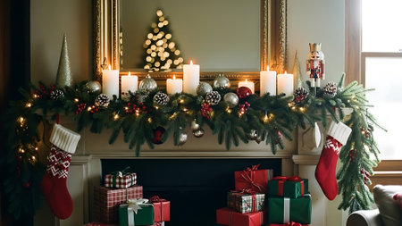 A cozy holiday scene featuring a decorated fireplace with stockings hung, adorned with greenery and lights, surrounded by wrapped gifts and a Christmas tree in the background
