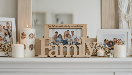 Cozy wooden photo frame on mantelpiece with Family engraving surrounded by photos and candles