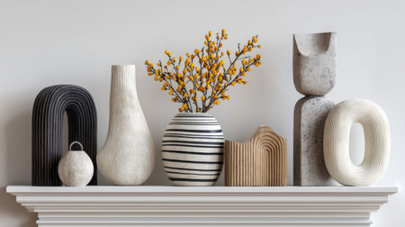 A stunning arrangement of modern decorative vases accompanied by a vibrant floral display, set against a neutral wall to enhance minimalist interior design.