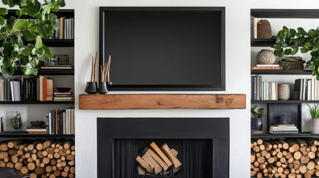 The fireplace mantle is adorned with small potted plants and modern art pieces adding a touch of greenery to the space. 2d flat cartoon