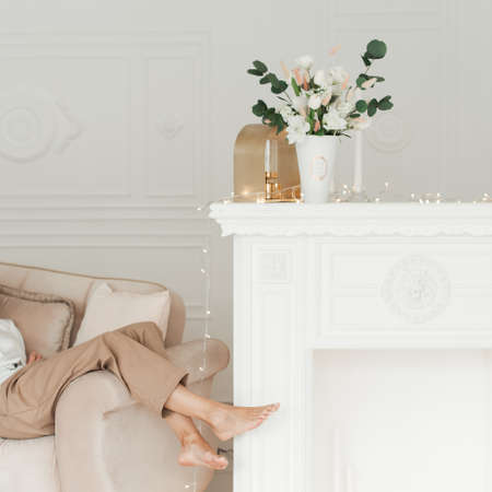 female feet on white vintage table background. interior