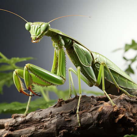 A vividly detailed praying mantis, with piercing eyes, poised elegantly as it surveys its surroundings.