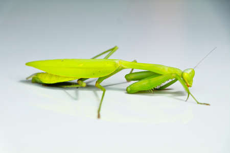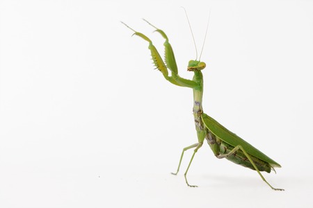 Green color praying mantis against white background, Mantodea order