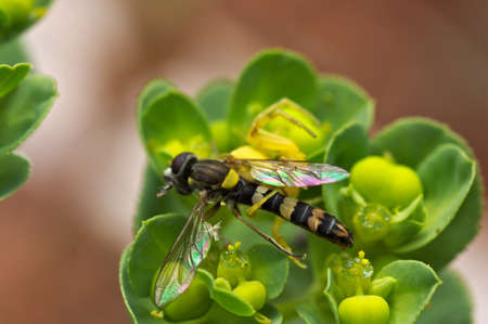 Close-up of a specimen of Sphaerophoria scripta that has been hunted by a spider when approaching a flowering plant