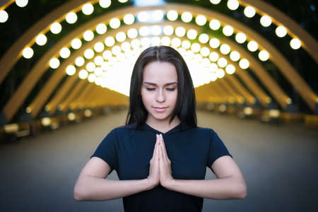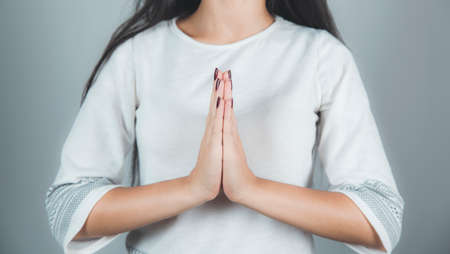 Woman praying and meditating with namaste gesture