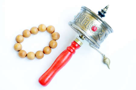 Tibetan prayer wheel and beads on a white background